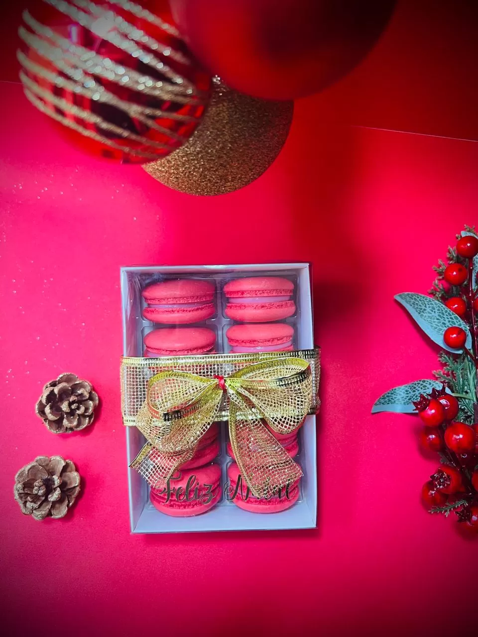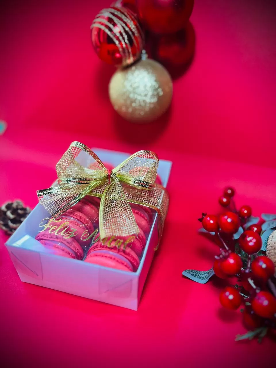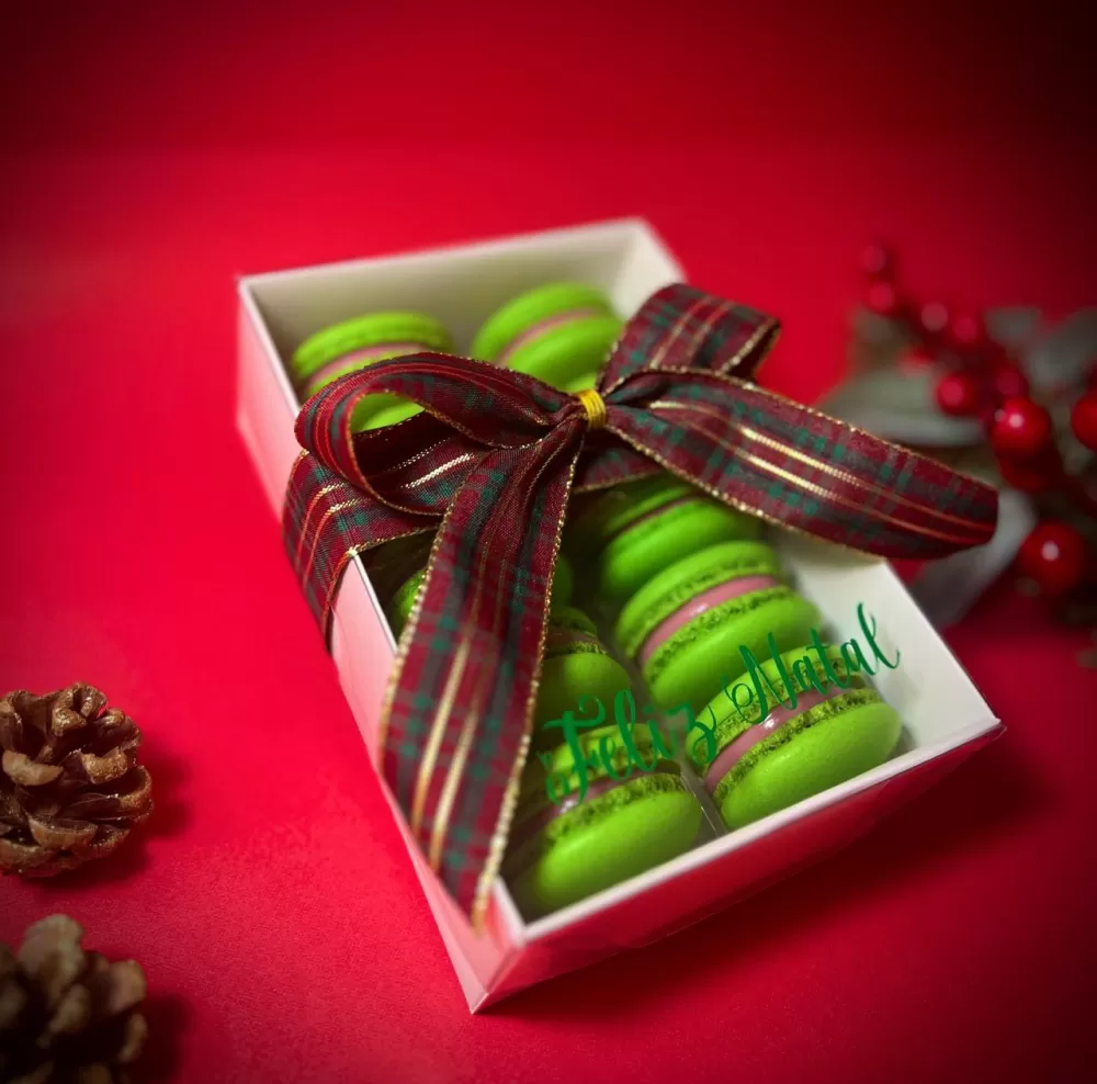 Caixa decorada de Natal contendo 10 unidades de macarons.