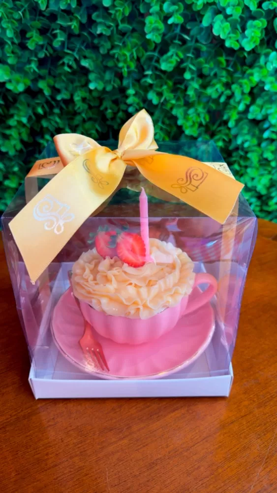 Embalado em caixa para presente, acompanhado de velinha e colher.
